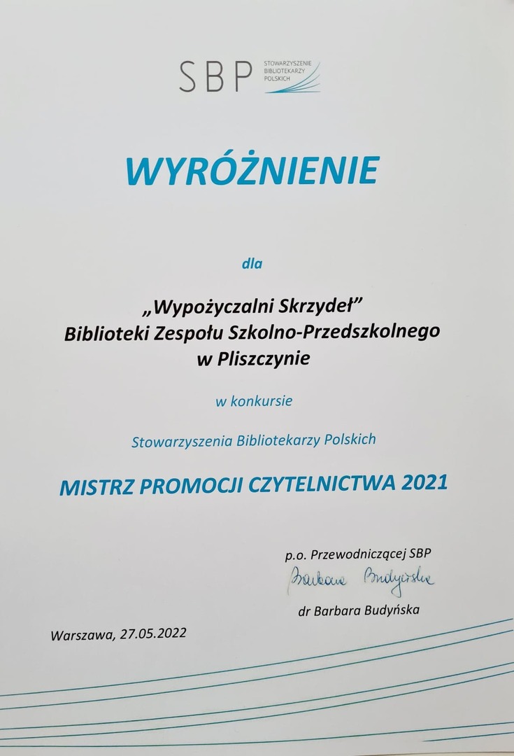 Wyróżnienie „ Mistrz Promocji Czytelnictwa 2021” odebrane.