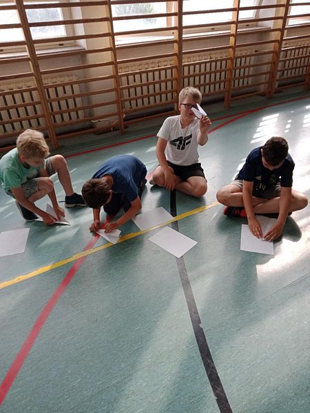 Wszyscy uczniowie- konstruktorzy papierowych samolotów mieli do dyspozycji pojedynczą kartkę formatu A4, którą mogli jedynie składać i dwie próby na puszczenie samolotu.