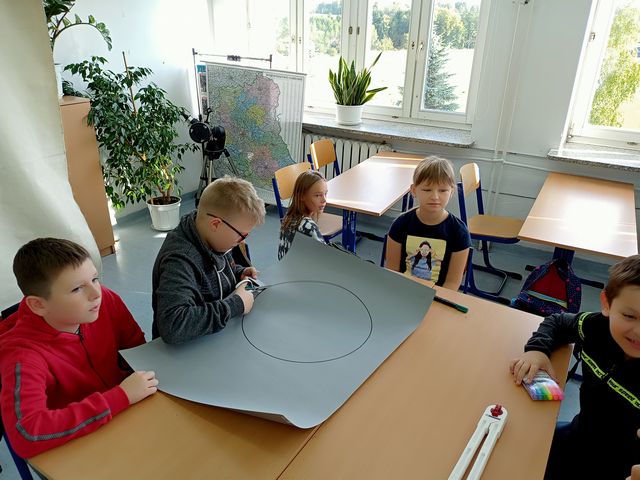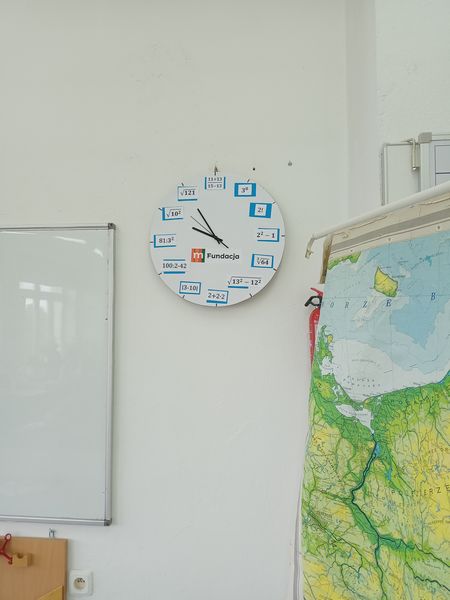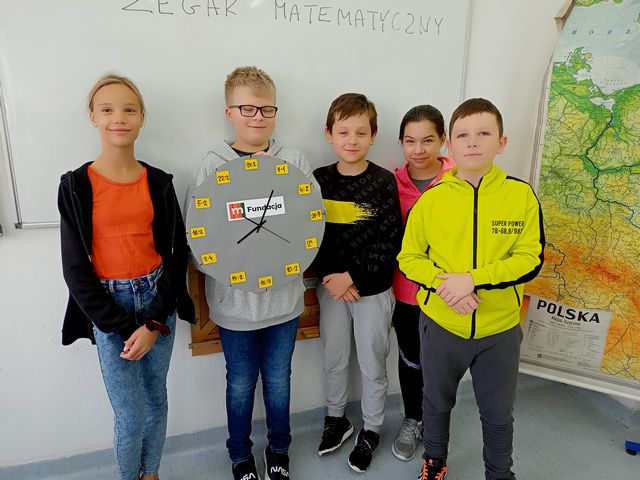 Uczniowie klasy 5 i 6 postanowili zrobić zegary matematyczne. Młodzież musiała wykonać wiele czynności. Po pierwsze pomierzyć, następnie narysować tarczę zegara, wyciąć, a na koniec zaszyfrować godziny zegarowe. Finalnie otrzymaliśmy dwa ciekawe zegary, które szybko odmierzają czas spędzony w szkole. Jeden z nich dumnie wisi na ścianie w pracowni matematycznej.