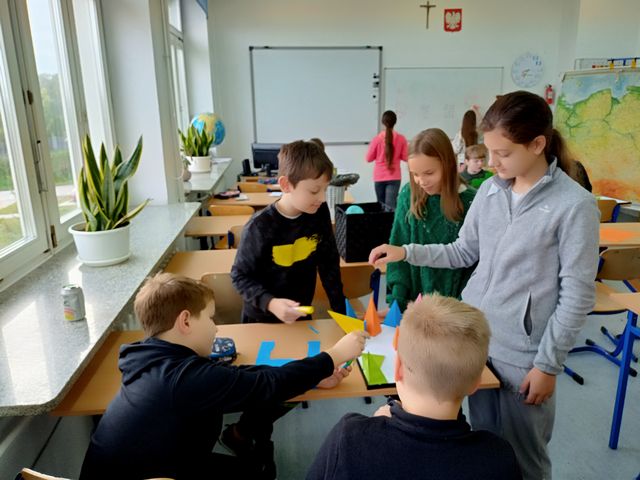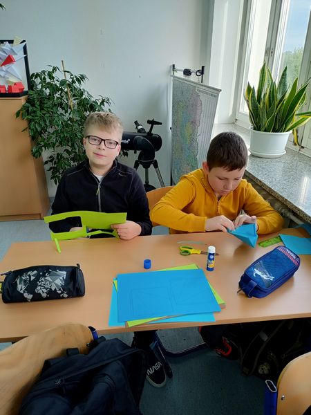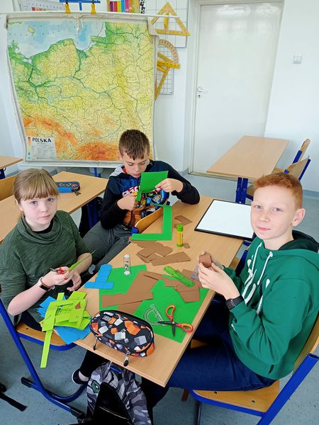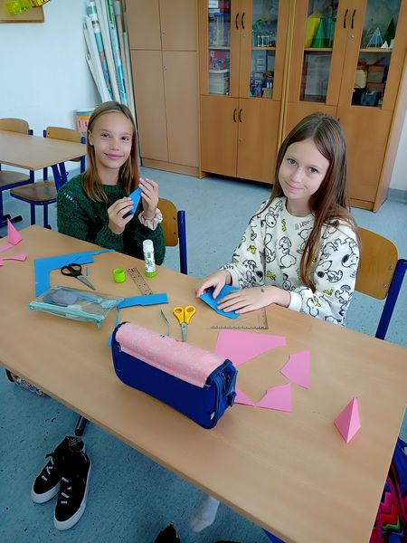 Uczniowie klasy piątej i szóstej postanowili zostać artystami i stworzyć obrazy przestrzenne. Nie była to łatwa praca, bo musieli poskładać i posklejać bryły, które stworzyły kompozycje. Należało być cierpliwym i dokładnym, w ruch poszły nożyczki i klej. Młodzież była bardzo zaangażowana, jednak bryły okazały się kapryśne, klej nie trzymał i ścianki się rozjeżdżały. Czasami pojawiał się krzyk rozpaczy i cała grupa ratowała sześcian lub ostrosłup.