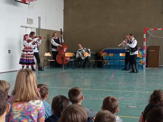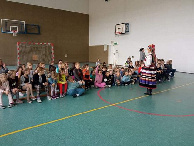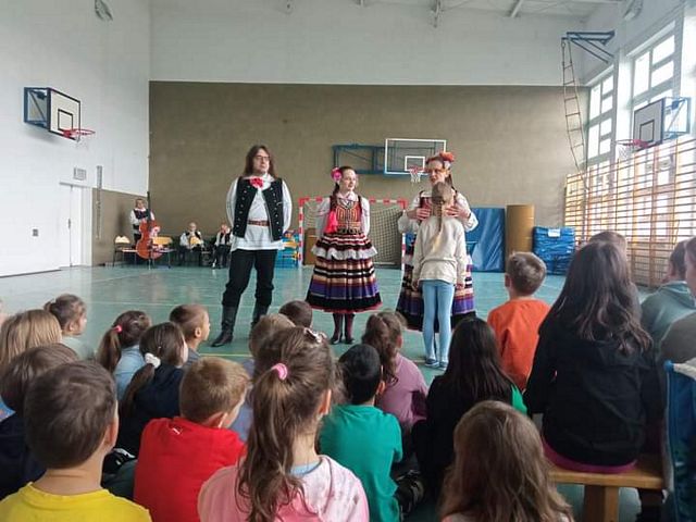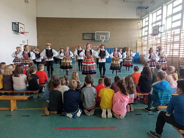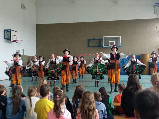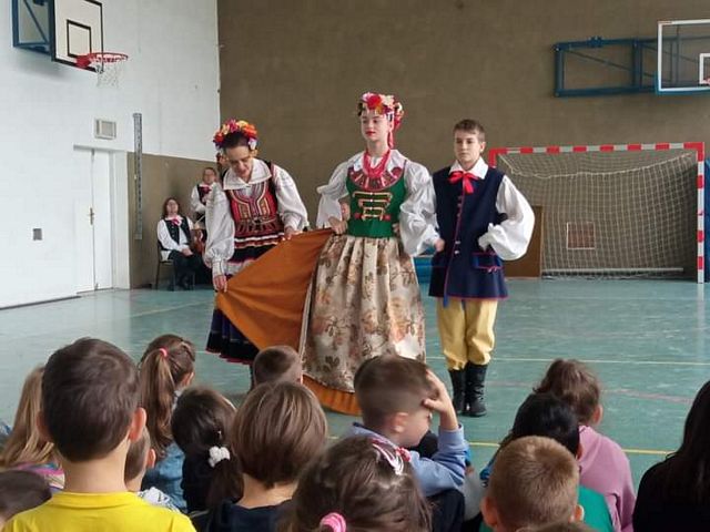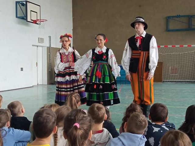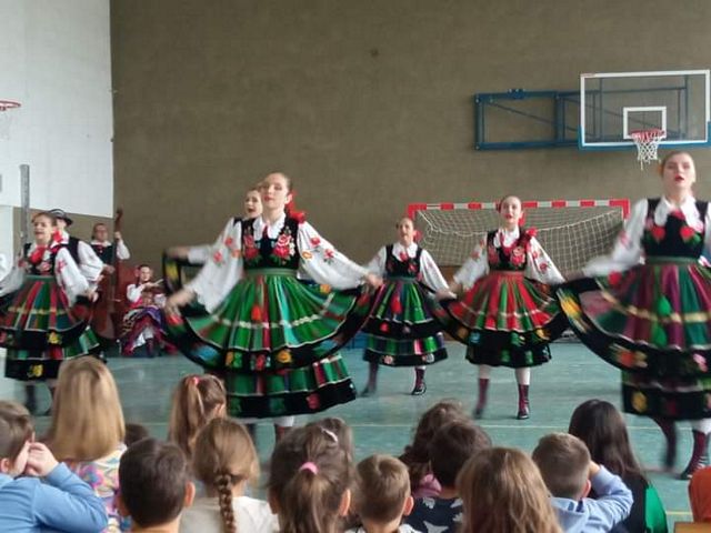 Ach, co to było za piękne widowisko. Gościliśmy dzisiaj Zespół Pieśni i Tańca "Lublin" im. Wandy Kaniorowej- Folk Dance Ensemble". Pięknie wystrojone panny i przystojni kawalerzy zaprezentowali folklor charakterystyczny dla trzech regionów Polski- lubelskiego, łowickiego oraz śląskiego. Historia zespołu sięga roku 1948, kiedy to w Lublinie powstał Teatr Młodego Widza, założony przez Wandę Kaniorową, znakomitego pedagoga i choreografa. Walory Zespołu znane są nie tylko widzom w kraju, ale także i na świecie. Jest on laureatem wielu Międzynarodowych Festiwali Folklorystycznych. Zespół pielęgnuje tradycje ludowe i zaszczepia pasje folkowe wśród najmłodszych, o czym przekonali się dziś uczniowie klas drugich i trzeciej. Bogactwo strojów, miłość do tańca, pasja i pozytywna energia rozgościły się dziś w naszej szkole przy akompaniamencie muzyków przygrywających na skrzypcach, kontrabasie, klarnecie, trąbce i akordeonie. Dziękujemy za wspaniałą lekcję.
