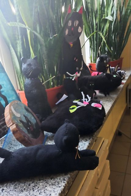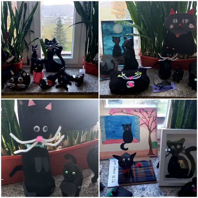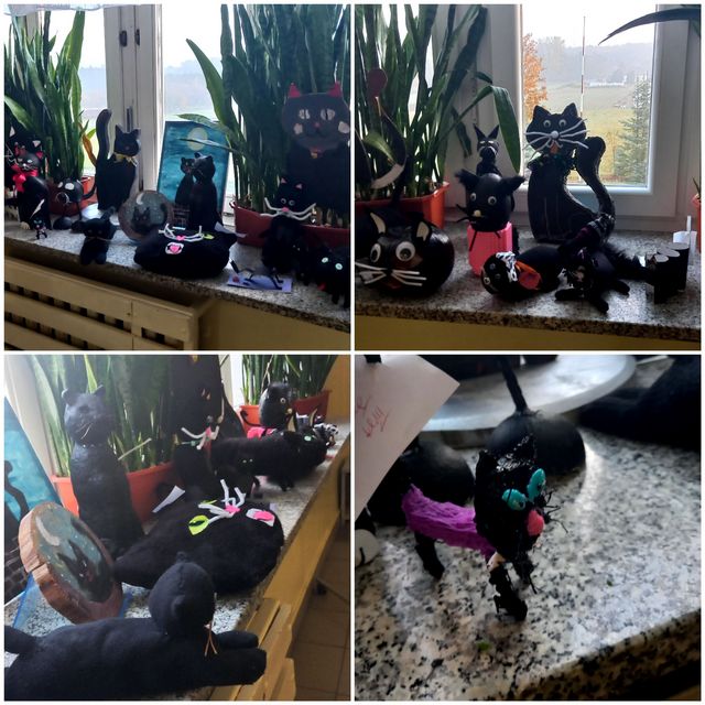 Jak powiedział Ernest Hemingway "Posiadanie jednego kota prowadzi do posiadania następnego." I coś w tym jest. I tak zadziało się u nas. Najpierw był jeden, a potem się namnożyło...co nas bardzo cieszy. Był to Wasz odzew na ogłoszenie konkursu plastyczno- technicznego "Czarny kot" dla uczniów klas 1-3. Dlaczego kot i w dodatku czarny? Ponieważ pozostając pod urokiem bohatera lektury "Cukierku, Ty łobuzie", postanowiliśmy kocie fascynacje i fascynacje kotami połączyć z Dniem Czarnego Kota, który obchodzony jest 27 października. I tak Wasze prace, są wyrazem pozytywnych uczuć dla tychże niesamowitych i tajemniczych stworzeń. Konkursowe koty były genialnie pomysłowe! BardzoWam dziękujemy za ich wykonanie. Gratulujemy laureatom i wszystkim, którzy do konkursu podeszli.