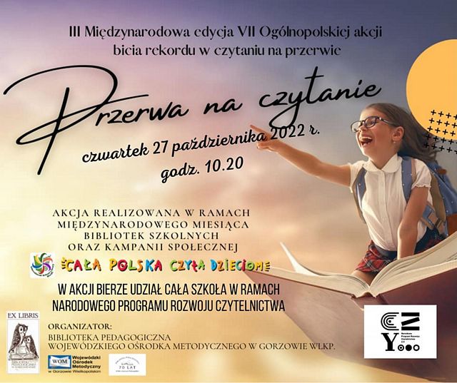 Biblioteka Pedagogiczna WOM w Gorzowie Wlkp. jest pomysłodawcą III Międzynarodowej edycji i VII Ogólnopolskiej akcji bicia rekordu w liczbie osób czytających na przerwie pt. Przerwa na czytanie – bicie rekordu w czytaniu na przerwie.
