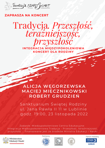 o godzinie 19.00 do Sanktuarium Świętej Rodziny w Lublinie (ul. Jana Pawła II 11, Lublin) na wielopokoleniową lekcję patriotyzmu, która odbędzie się w ramach Projektu Integracja międzypokoleniowa - tradycja, teraźniejszość, przyszłość kultywującego tradycję wspólnego rodzinnego śpiewania w ROKU POLSKIEGO ROMANTYZMU. Przedsięwzięcie finansowane jest przez Ministerstwo Edukacji i Nauki a partnerami projektu są Fundacja imienia Mikołaja