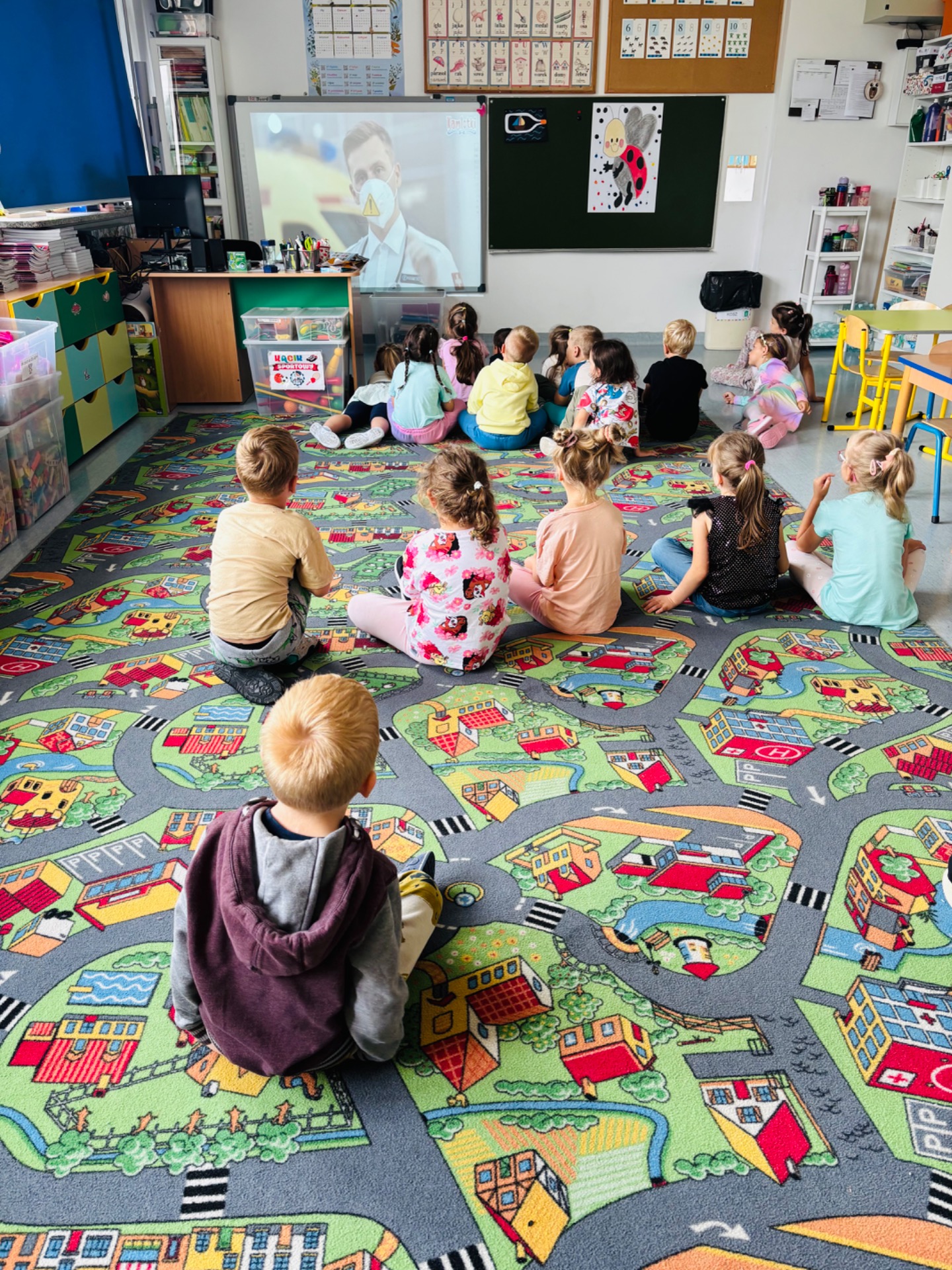 Zajęcia rozpoczęliśmy od rozmowy na temat sytuacji, w których ktoś może potrzebować pomocy – dzieci chętnie dzieliły się swoimi doświadczeniami i opowiadały, jak reagują, gdy ktoś się przewróci, skaleczy lub źle się poczuje. Następnie wspólnie obejrzeliśmy krótką edukacyjną animację, która pokazała, jak zachować się w sytuacji zagrożenia i jak wezwać pomoc, dzwoniąc na numer alarmowy 112.
