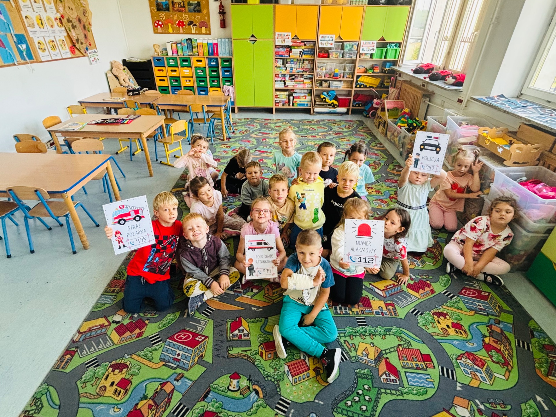 Podczas zajęć utrwaliliśmy również znajomość numerów alarmowych oraz zasad bezpiecznego zachowania się w domu i na placu zabaw.