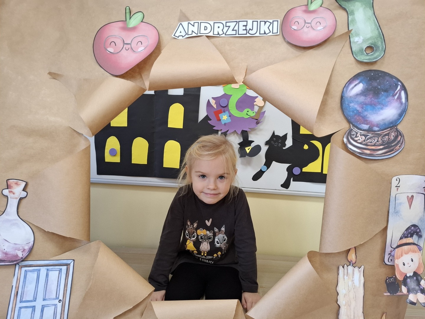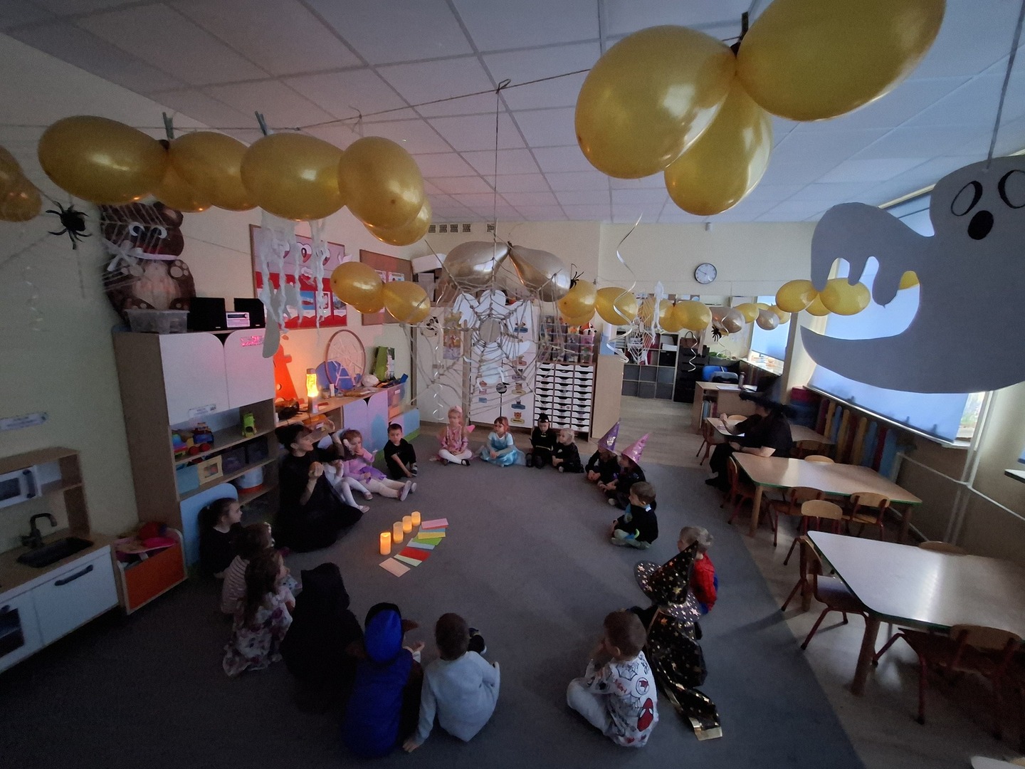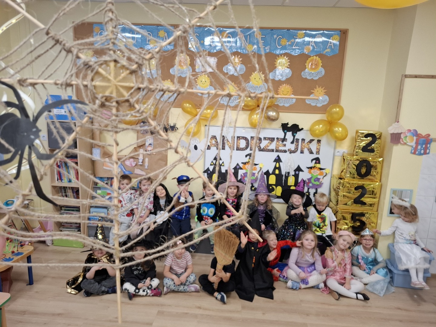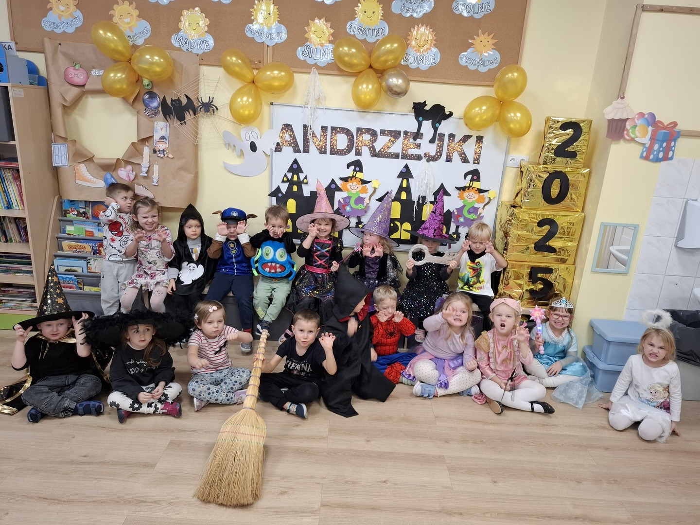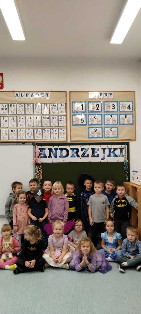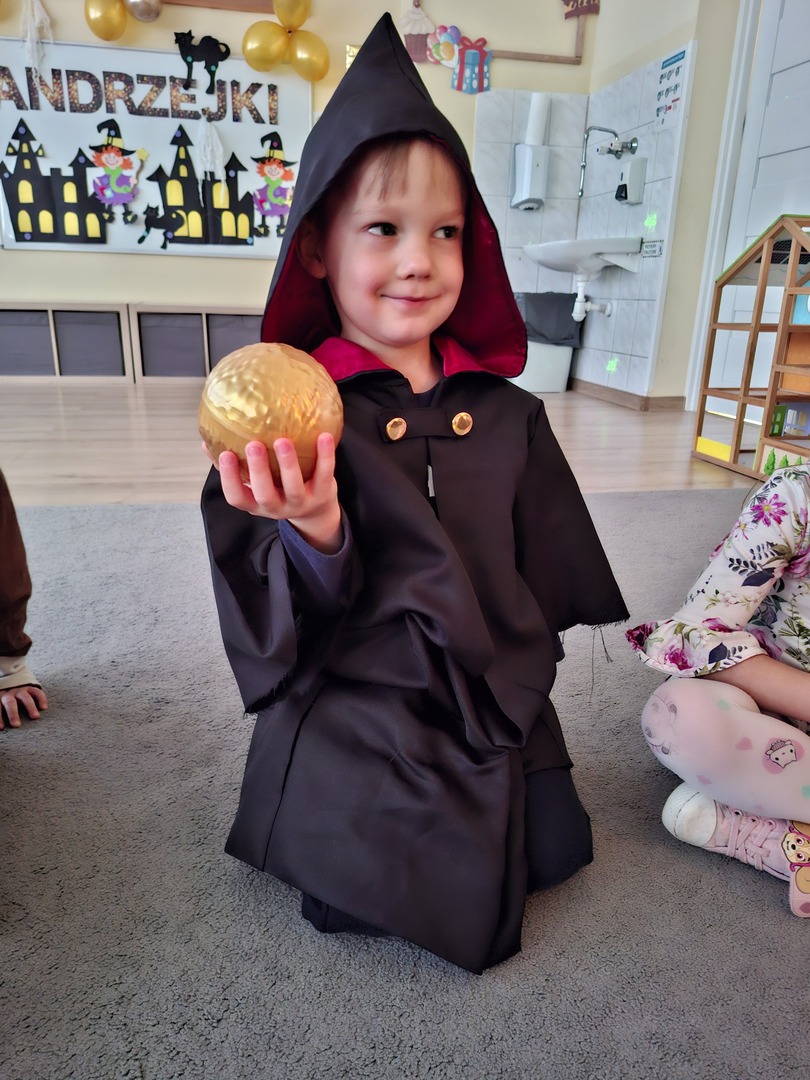 Kolorowe światła, niecodzienna dekoracja wprowadziły nastrój tajemniczości i wyjątkowości a andrzejkowy klimat dopełniły piękne stroje. W jednym kręgu pląsały koty, duchy, strachy, nietoperze, czarodzieje i czarodziejki, a także postacie z bajek. Ogromną radość sprawił taniec z miotłą, dzieci poznały nie tylko tradycyjne wróżby, ale również przygotowywały eliksiry, próbowały zburzyć piramidę z duszków, wypełnić pajęczą sieć i wiele innych… wszystko to płynęło w rytm tanecznych kroków a chwile odpoczynku od zabaw i pląsów zapewnił dzieciom poczęstunek.