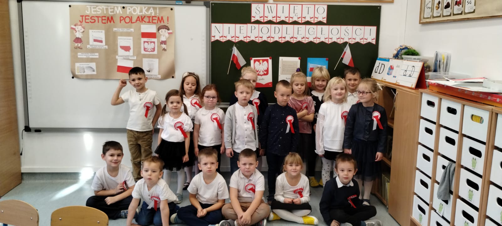 7 listopada odbyła się uroczystość upamiętniająca odzyskanie niepodległości przez Polskę. Z tej okazji zerówkowicze i 5 latki zebrali się, na sali gimnastycznej, aby uroczyście świętować ten wyjątkowy dla Polaków czas. Uroczystość rozpoczęła się wspólnym zaśpiewaniem hymnu polskiego, następnie odbyła się piękna część artystyczna. Wszyscy z powagą i w dużym skupieniu oglądali program artystyczny. Młodsze grupy świętowały ten dzień w swoich salach, gdzie również odśpiewały hymn Polski. Dodatkowo nauczycielki zapoznały dzieci z symbolami narodowymi, a na koniec przedszkolaki wykonały pracę plastyczną.