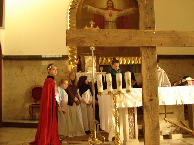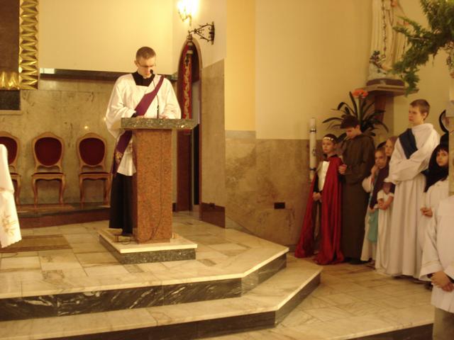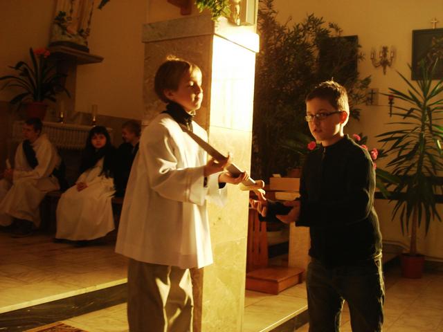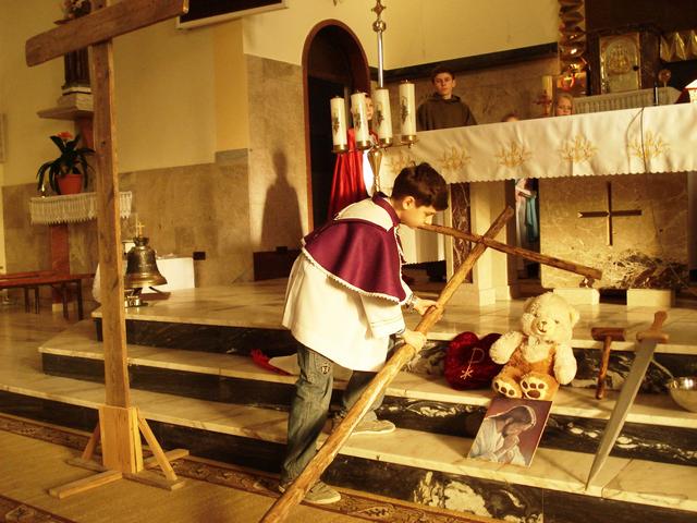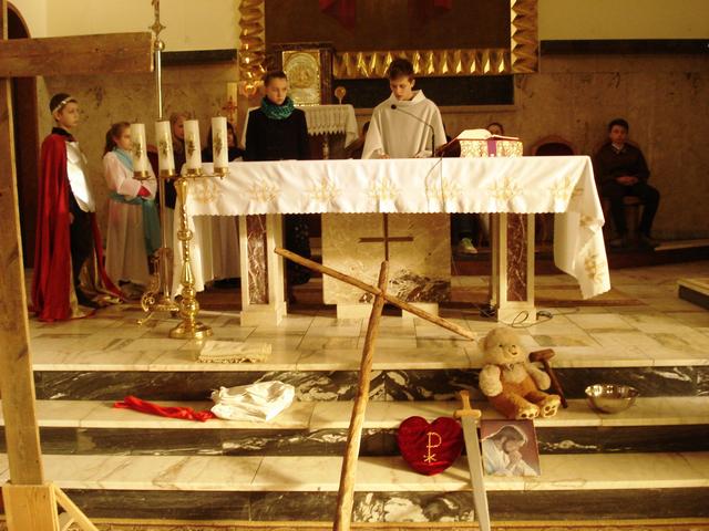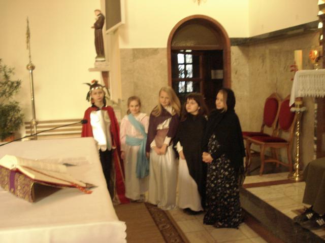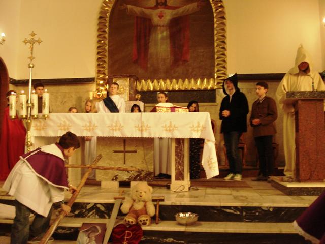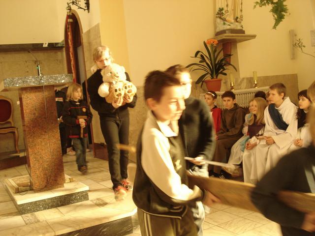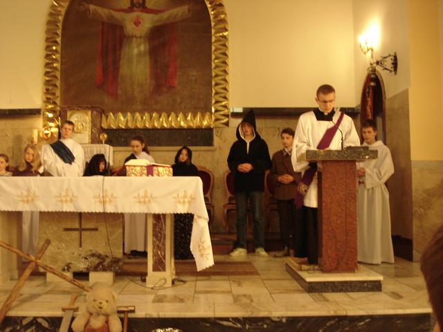 14 marca uczniowie i absolwenci poprowadzili nabożeństwo Drogi Krzyżowej „Kim jesteś”. Wcielili się oni w różne postaci biblijne, opowiadające o spotkaniu z Jezusem, niosącym krzyż. Rozważania nie tylko przypominają wydarzenia sprzed dwóch tysięcy lat, ale pomagają dostrzec drugiego człowieka na swojej drodze życia, porozmawiać z nim i wysłuchać go. W skupieniu uwagi pomagały rzeczy - symbole, przynoszone przez bardzo przejęte dzieci do ołtarza oraz charakteryzacja osób, czytających rozważania. Spotkany Jezus przypomniał wszystkim, że nieustannie idzie przez świat i zaprasza do nawrócenia. Nabożeństwu przewodniczył diakon Wojciech, który jest u nas na praktyce, włącza się aktywnie w życie szkoły i parafii. Drogę Krzyżową przygotowali katecheci.