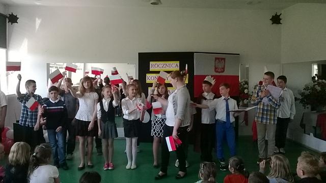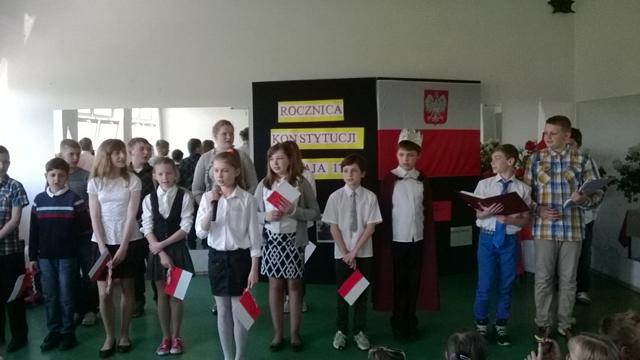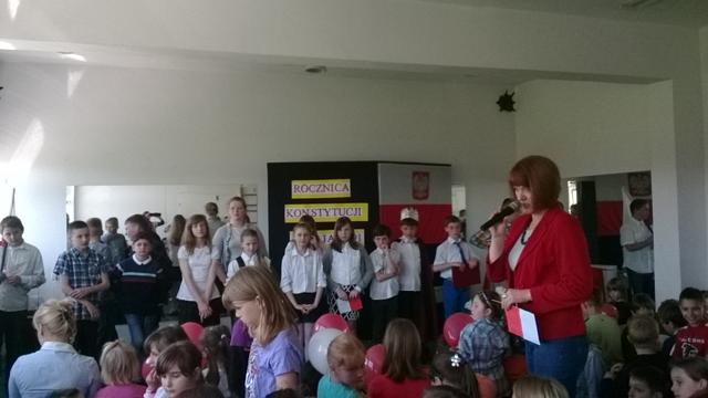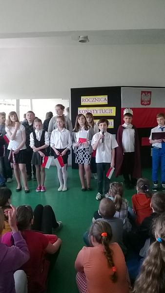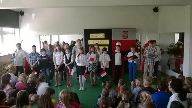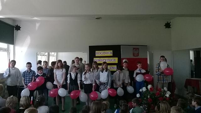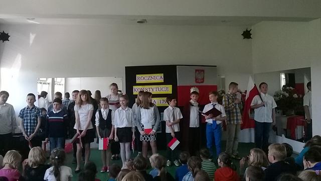 Dnia 29 kwietnia uczniowie naszej szkoły zebrali się na małej sali gimnastycznej, aby świętować 223 rocznicę uchwalenie Konstytucji 3 Maja. Uroczystość rozpoczęliśmy hymnem. Sala była pięknie udekorowana w barwy biało-czerwone. Następnie uczniowie klasy 5 opowiedzieli nam na czym polegało podpisanie Konstytucji 3 Maja. W ciekawy sposób pokazali nam jak to się wydarzyło. Między występami recytatorskimi śpiewali znane pieśni patriotyczne, takie jak:"Zgoda sejmu", "Majowa jutrzenka" oraz kilka innych. Na koniec nasi koledzy z klasy 5 wnieśli piękny bukiet róż biało-czerwonych. Uroczysty apel skończył się piosenką o umiłowanej ojczyźnie, a dzieci otrzymały białe i czerwone baloniki. Miłym gestem ze strony artystów było wręczenie własnoręcznie wykonanych flag. Wszyscy cieszyliśmy się z tego, że żyjemy w wolnym kraju.